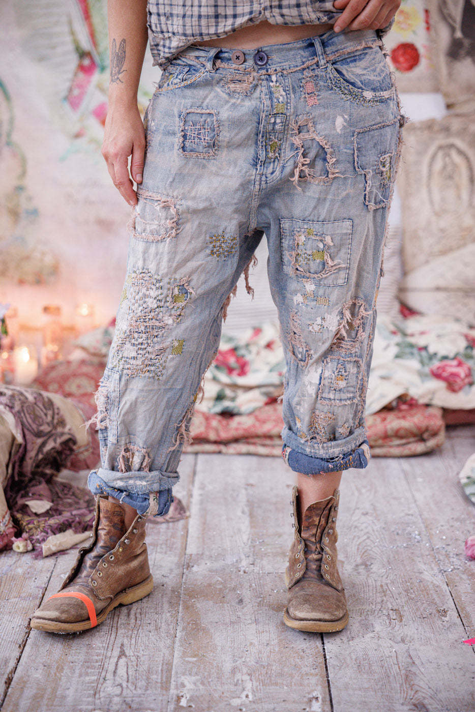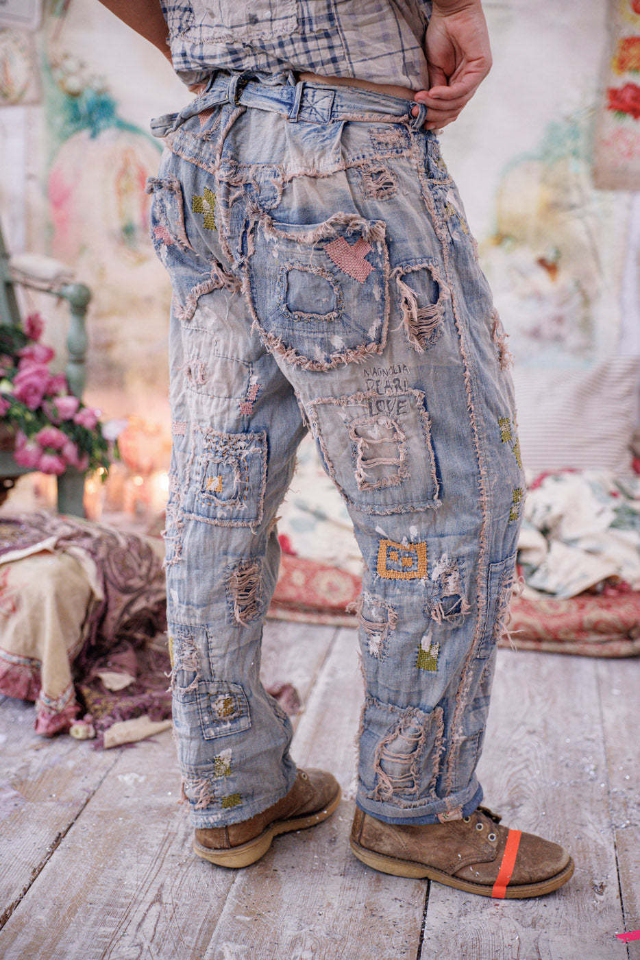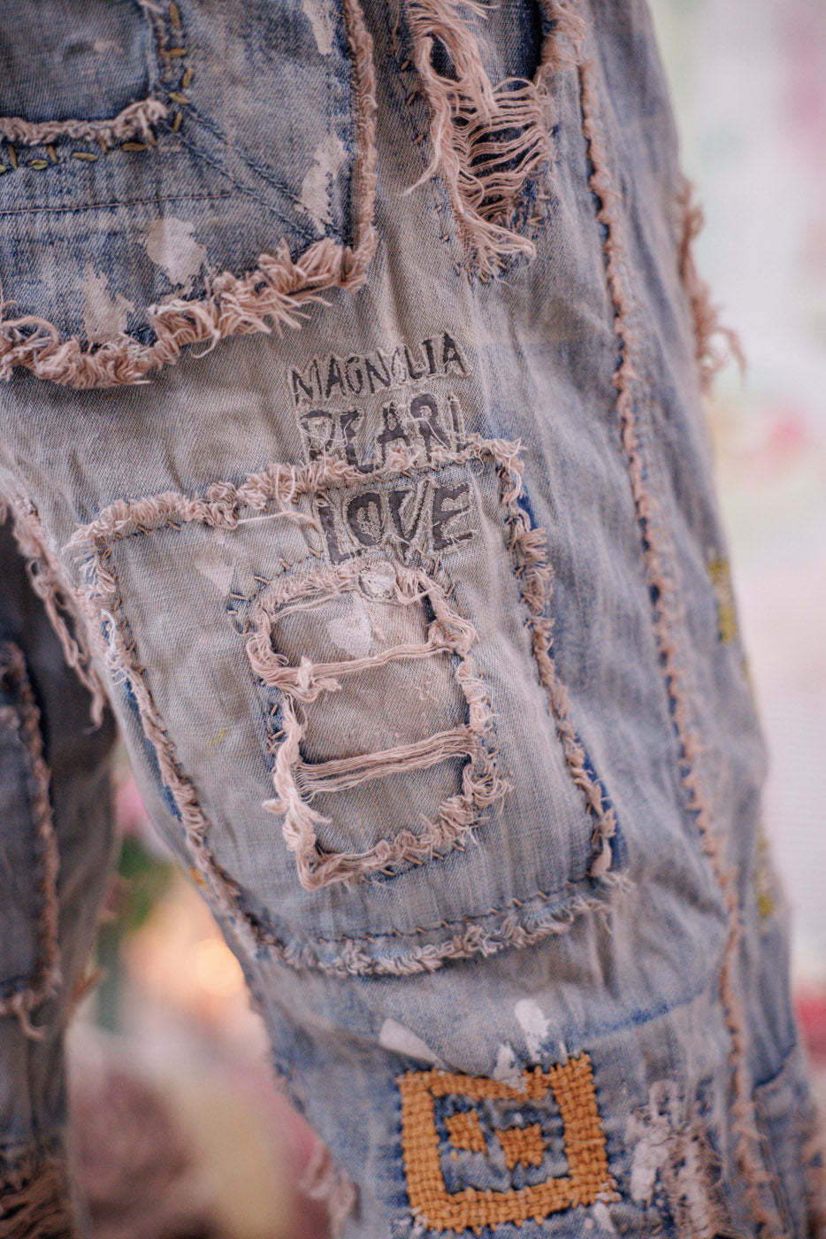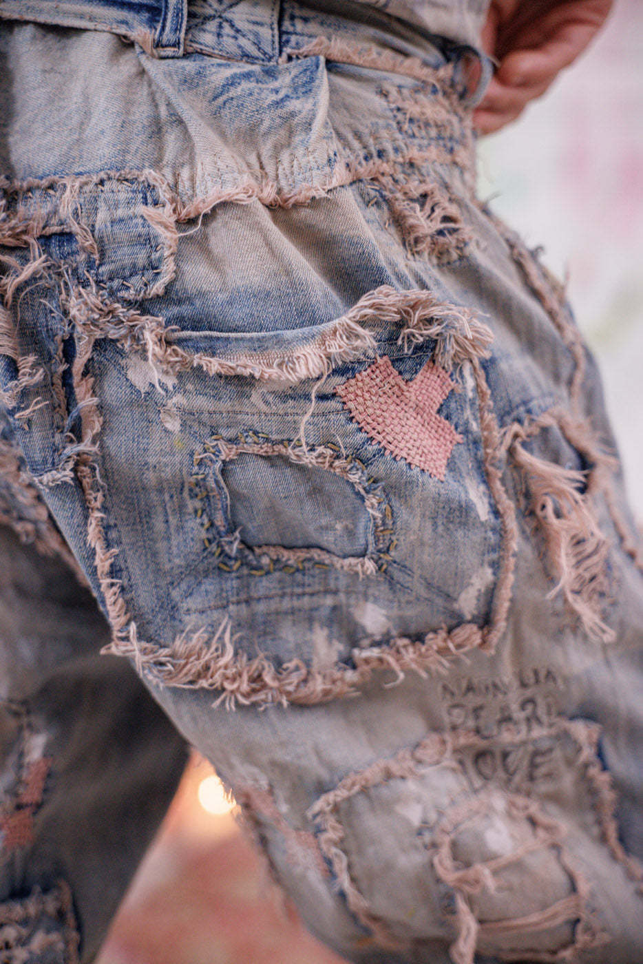 • Heavy Hand-Fading, Distressing, Patching, Mending, Stitching